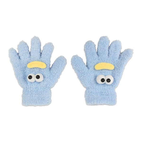 Перчатки трикотажные для девочки выполнены в ярком голубом цвете с забавным дизайном — на каждом изделии расположены большие выразительные глаза и яркая желтая улыбка. Модель выполнена из пушистой мягкой пряжи, которая придает теплоту и комфорт при носке.