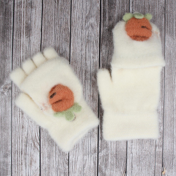 Перчатки-рукавицы для девочки выполнены из мягкого нежного материала в бежевом цвете. Модель сочетает удобство открытых пальцев с возможностью накрыть их планкой. Изделие подходит для прохладной погоды и способствует сохранению тепла рук. Откинуть верхнюю часть можно с помощью петельки и пуговицы. Такие рукавицы удобны для детских прогулок и занятий на улице.