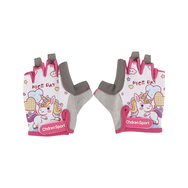 На тыльной стороне имеется принт с изображением сказочного единорога. Лицевая сторона перчатки – черная, тыльная – белая. Кант отделан красной тесьмой.