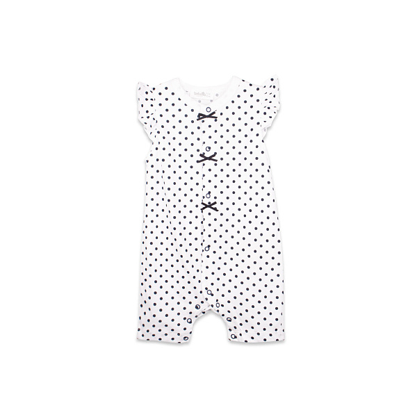 Девочке будет летом комфортно в облегченном боди с открытыми ручками и ножками. В отличие от раздельных комплектов, такая одежда не сползает и не мешает — тело закрыто, а кнопки по всему периметру предотвращают сползание памперса. Они же помогают быстро сменить песочник при необходимости. Дышащий мягкий и приятный на ощупь хлопок чудесно пропускает воздух, ребеноку не жарко. Привлекает и расцветка — мелкий черный горошек на белом фоне, а в качестве декора — воланы на рукавах и бантики в тон. Рекомендовано для детей ясельного возраста.