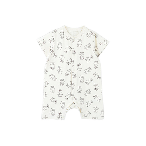 Бежевый песочник для девочек с короткими рукавами и штанинами на лето. Выполненный из качественной натуральной ткани (100% хлопок) с принтом в виде забавных мультяшных зайцев. Приятный к телу хлопковый материал дает коже ребенка дышать и выводит лишнюю влагу.