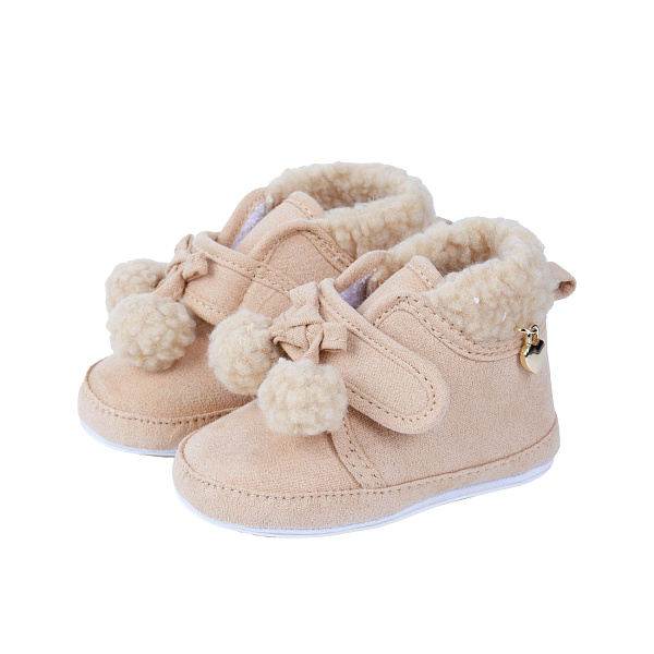 Выбор обуви для маленького ребенка – задача не из легких. Выбранная модель должна красиво выглядеть, комфортно сидеть на ножке и не стеснять движений малыша, иначе он будет постоянно снимать ее. Отличным выбором являются пинетки, изготовленные из текстиля, которые приятно прилегают к коже и дарят комфорт в носке. Цвет изделия: бежевый. Элементом декора выбраны 2 помпона, завязанные спереди на бантик. Внутри модель утеплена текстилем, поэтому ножка ребенка останется в тепле. Подошва выполнена из ПВХ, который не утяжеляет ботинок и сохраняет свободу движения малыша. Рекомендовано для детей ясельного возраста.
