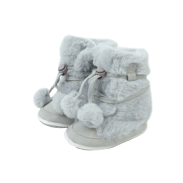 Мягкие и пушистые текстильные пинетки согреют ножки малыша в прохладную погоду. Верх обуви изготовлен из текстиля и покрыт светло-серым мехом. Спереди имеются завязки с помпонами и фиксатором – с его помощью можно легко утянуть пинетки по объему ноги. Подкладка и стелька из хлопчатобумажной ткани обеспечит ногам сухость и комфорт в процессе носки. Подошва выполнена из легкой и эластичной термопластичной резины.