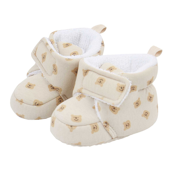 Мягкие бежевые пинетки с очаровательным принтом в виде маленьких медвежат станут уютным и практичным дополнением в гардеробе маленькой девочки. Спокойный и теплый оттенок бежевого легко сочетается с разнообразной одеждой, как для дома, так и для прогулок. Мягкая тканевая поверхность комфортно прилегает к ножке, обеспечивая тепло и защиту от холода, а удобная застежка на липучке надежно фиксирует пинетки, не сковывая движений ребёнка.