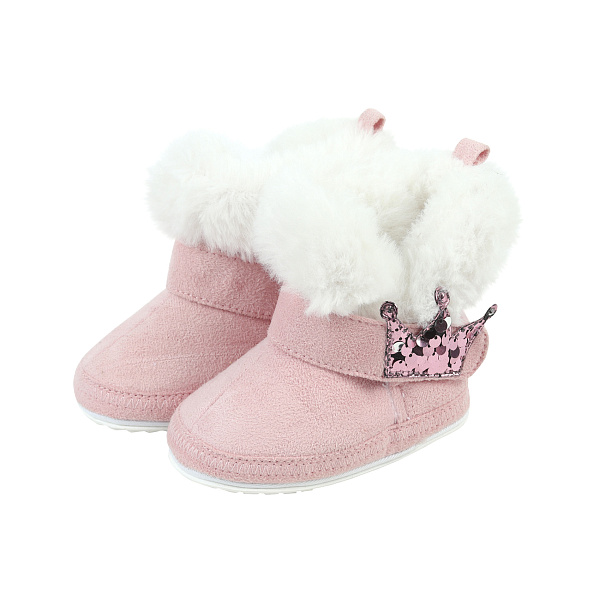 Милые детские пинетки для девочек. Они изготовлены из текстильного материала розового цвета с белой опушкой из искусственного меха. Легко застегиваются и снимаются благодаря застежке на липучке. Сбоку ботинки украшает миниатюрная корона, расшитая блестками.