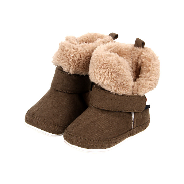 Уютные пинетки для мальчиков. Выполнены из текстильного материала красивого коричневого цвета. Внутри дышащая хлопчатобумажная стелька. В районе щиколотки есть мягкая опушка из искусственного меха. Ботинки можно легко и быстро снять и надеть благодаря удобной застежке на липучке.