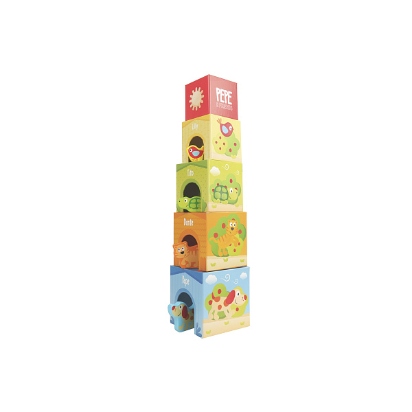 Развивающий набор Hape «Башня дружбы» порадует маленького непоседу и положительно повлияет на его развитие. Красочная коробка содержит внутри 5 кубиков разных цветов и размеров. Ребенку предстоит собрать из кубиков пирамидку, но для этого потребуется ловкость, усидчивость, моторика рук и логика. Каждый кубик должен стоять на своем месте, ведь на одной из сторон нарисована дорога и нельзя, чтобы она прерывалась. Внутри каждого кубика живет добрый зверек, который будет помогать в строительстве: собака Пепе, кот Данте, черепаха Тито и птичка Лилли. При желании ребенок сможет выстроить кубики-домики в ряд, чтобы питомцы жили рядом.