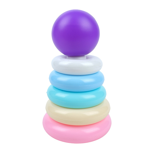 Пирамидка состоит из пяти разноцветных колец и шарика для вершины. Цвета изделия яркие. Кольца имеют разный диаметр. Они легко надеваются на центральную ось. Сборка и разборка пирамидки развивает ловкость рук. Ребенок знакомится с понятиями «больше» и «меньше». Игра формирует представление о последовательности и размерах. Яркий шарик завершает конструкцию.