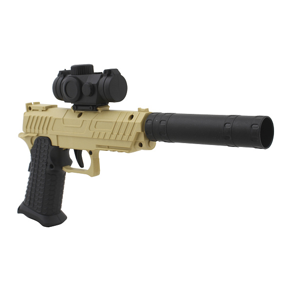 Пистолет и мишень выполнены в насыщенных тонах – оружие стильного песочного цвета с черной рукояткой и насадкой. Круглая компактная мишень с четкими метками и цифрами для точной стрельбы. Пистолет оснащен прицелом, который добавляет реалистичности игре и помогает повысить точность выстрелов. Мишень ставится на плоскую поверхность и отлично подходит для тренировок меткости.