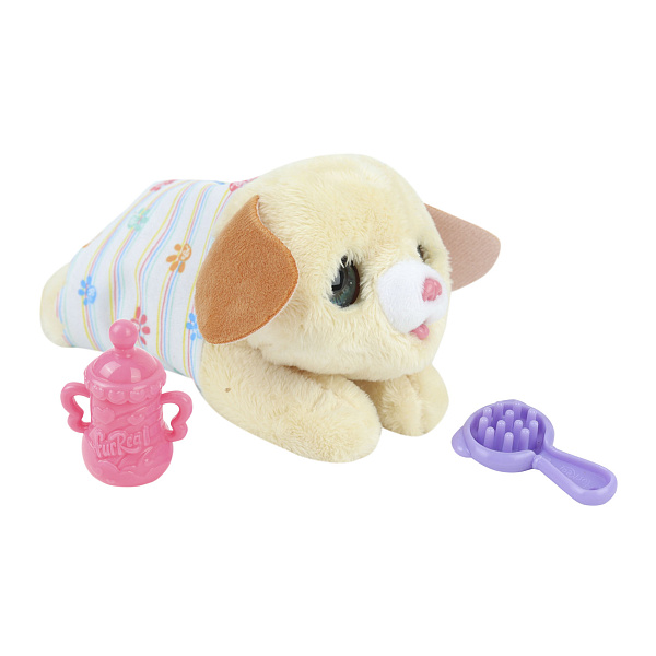 Игрушка умеет закрывать глаза, имитируя сон, и издавать звуки. В комплекте к ней идет гребешок и бутылочка для кормления, которые помогут ребенку полностью погрузиться в процесс ухода за питомцем.