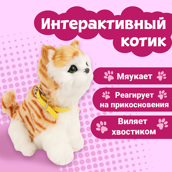 Интерактивная игрушка «Котенок» представляет собой реалистичную пушистую игрушку, выполненную из мягкого материала с белой и рыжей окраской, напоминающей настоящую шерсть. Большие зеленые глаза добавляют котенку выразительности и привлекательности. Яркий желтый ошейник украшает шею игрушки, придавая ей законченный и ухоженный вид.