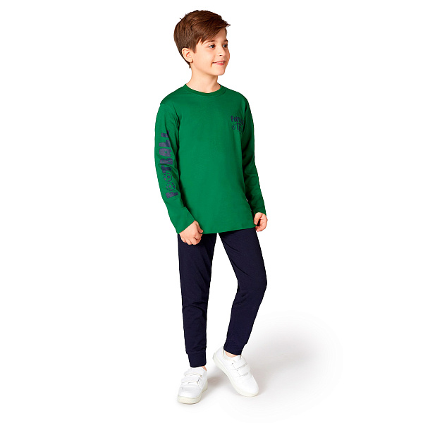 Пижама для мальчика — удобный и практичный комплект для уютного отдыха и спокойного сна. Верхняя часть выполнена в насыщенном зелёном цвете и украшена яркой надписью «Football time» на груди и рукаве, что придаёт изделию спортивный и энергичный вид. Чёрные брюки с удобными манжетами обеспечивают плотную посадку и не мешают активным движениям ребёнка и не сковывает движений во сне.