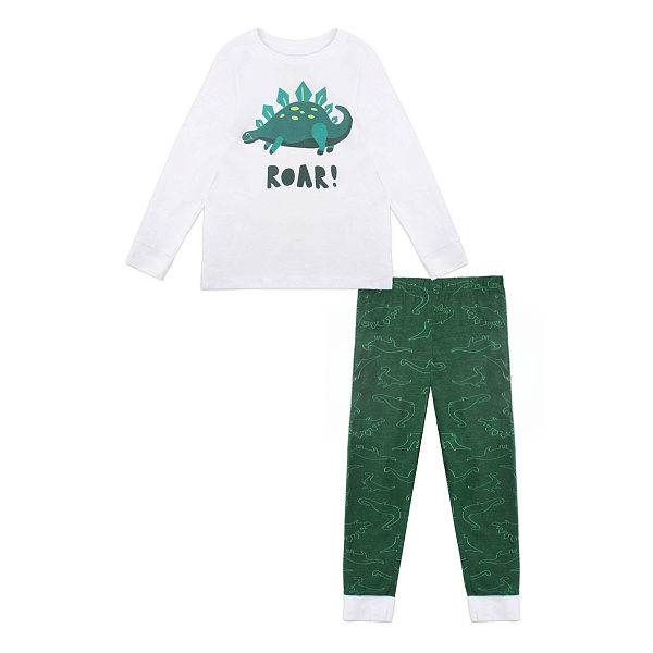 - Цвет: футболка — белая с ярким принтом динозавра, брюки — тёмно-зелёные с рисунком динозавров