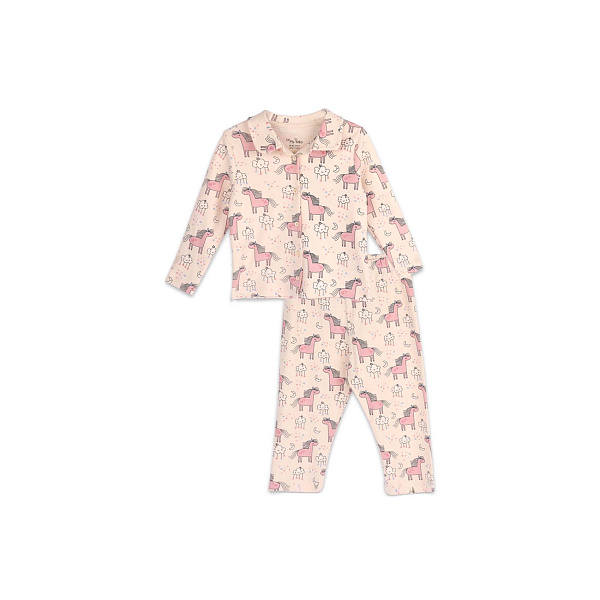 Уютная пижама классического кроя предназначена для маленькой девочки. Она создает все условия для крепкого и полноценного сна. Модель оформлена в спокойной цветовой гамме, украшена изображениями забавных лошадок. В комплект входят свободные штаны на резинке и кофточка с пуговицами. Одежда не сковывает движения, не вызывает сложностей с переодеванием, станет любимым ночным нарядом юной модницы.