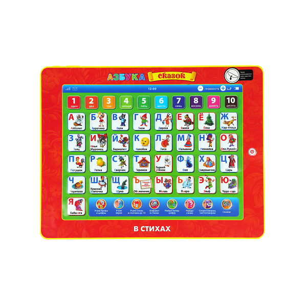 Сенсорный планшет «Азбука сказок» непременно понравится малышу: 56 скороговорок, стихов и сказок, 8 обучающих программ, 2 вида экзамена. Игрушка оснащена также кнопкой питания и регулировки громкости.