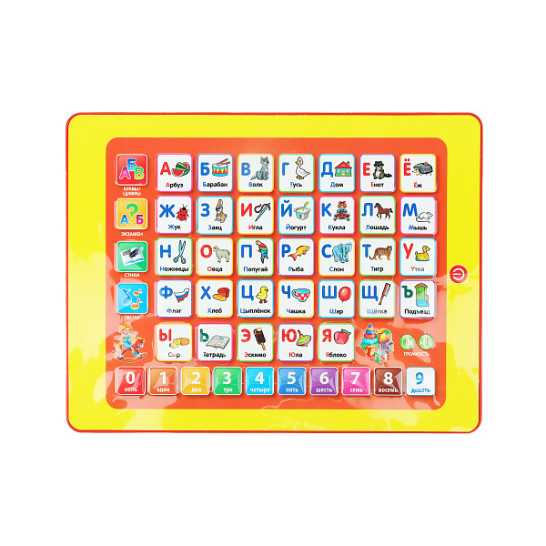 Сенсорный обучающий планшет со стихами Агнии Барто поможет малышам начать изучение азбуки. Нажимая на кнопки, ребенок вместе с игрушкой будет повторять буквы, слова, учить стихи и песни. Планшет также проверяет знания детей через функцию «Экзамен». Удобный формат позволяет брать умную игрушку с собой на прогулки, в поездки и путешествия. Играя, малыш учится, развивает моторику, память, внимание и музыкальный слух.