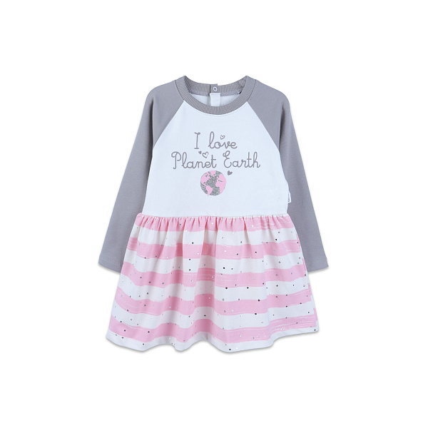 Легкое платье комбинированной однотонной ткани с принтом выполнено в стильном сочетании серого, белого и розового цветов. Объемная юбка и декор розового цвета привлекают внимание юной модницы. Крой изделия свободный, а рукава типа реглан серого цвета не сковывают движений. Горловина окантована при помощи трикотажной бейки в сером цвете. Спереди располагается надпись рукописным шрифтом с завитками и рисунок глобуса. Белая в широкую розовую полоску юбка слегка присборена по линии талии. В основе ткани использован хлопок и эластан. Рекомендовано для детей ясельного возраста.