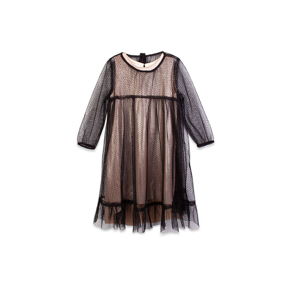 Изящная модель детского платья привлекает внимание нестандартным дизайном. Нижний слой платья розовый, сверху наряд дополнен полупрозрачной черной тканью, которая обавляет изящности и элегантности в образ. Сочетание черного и розового делает платье оригинальным и запоминающимся. Рукава платья длинные, дополнены тонкими резинками. Оборки на юбке завершают дизайн нарядного платья. Наряд застегивается на пуговицу и завязки.