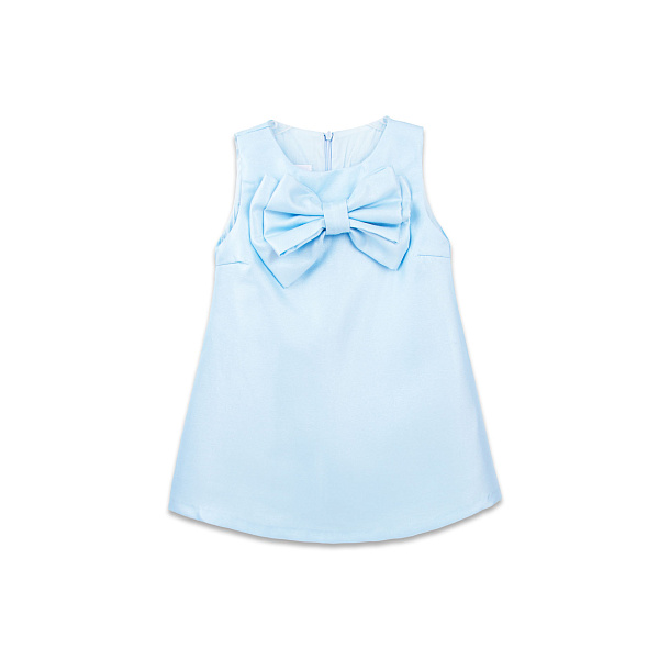 Платье имеет скрытую застежку «молния», которая облегчает одевание ребенка. Классический трапециевидный фасон, отсутствие рукавов и воротника делают платье похожим на коктейльное, а красочный бант на груди завершает образ, придавая элегантный вид. Наряд подойдет как для посещения детских учреждений, так и для торжественных случаев.