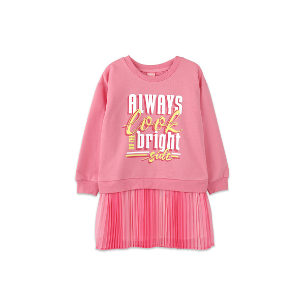 Оригинальное платье позволит внести разнообразие в гардероб девочки дошкольного возраста. Верхняя часть с длинным рукавом органично сочетается с плиссированным низом, имитирую костюм. Украшением служит крупная надпись на груди. Свободный крой гарантирует отличную посадку на фигуре любого типа. Одежда не сковывает движения ребенка, не отвлекает от занятий и активных игр.