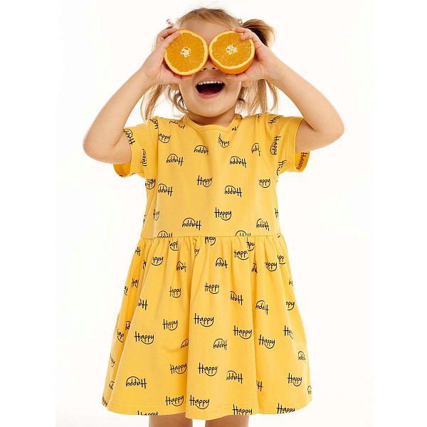 Легкое платье с коротким рукавом – универсальная деталь гардероба маленькой принцессы. Яркий и сочный цвет делает образ запоминающимся. Принт в виде надписей в сочетании с солнечным оттенком символизирует счастливое и беззаботное детство.