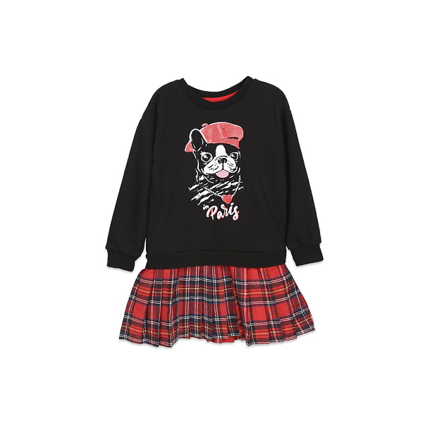 Практичное платье с длинным рукавом можно использовать в качестве наряда к торжественному событию или в повседневной жизни. Модель с заниженной талией и юбкой в складку с расцветкой в шотландскую клетку чудесно подходит для девочек дошкольного и школьного возраста. Горловина обработана тесьмой, на рукавах есть манжет – трикотажная резинка. Объемная нашивка на груди в виде милого собачонки в чепчике поднимет настроение родителям и обладательнице наряда. Для пошива использованы мягкие и приятные на ощупь материалы: лиф и юбка – хлопок и полиэстер, а подкладка из хлопка.