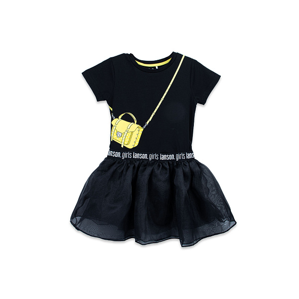 Изящное короткое черное платье Lanson kids чудесно подойдет для летних прогулок по городу. Тонкая летучая ткань юбки придает образу нежность и игривость, а верх, изготовленный из натуральног хлопка, не сковывает движений и защищает тело от перегрева, несмотря на темный цвет. В качестве декора использован принт в виде имитированной желтой сумочки, которая выглядит, словно настоящая. Завершает образ такой же имитированный поясок с надписями "Lanson kids".