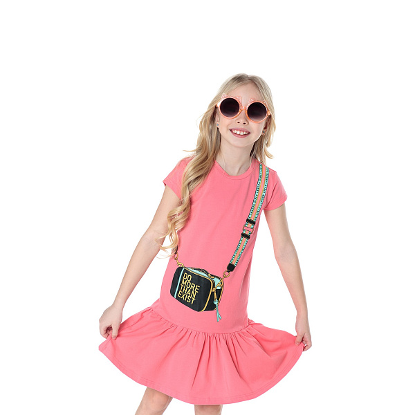 Легкое платье с коротким рукавом привлекает внимание свободным кроем и оригинальным дизайном. Модель украшена рисунком, имитирующим модную сумочку. Это вызовет восхищение у каждой маленькой девочки. Изделие ориентировано на ребенка дошкольного и школьного возраста. Для пошива использован мягкий трикотаж, в составе которого 5% эластана и 95% хлопка. Такой материал не препятствует свободному воздухообмену, чудесно впитывает влагу, не деформируется, не линяет, не мнется, при этом легко отстирывается от загрязнений. Производитель напоминает о необходимости предварительной стирки.
