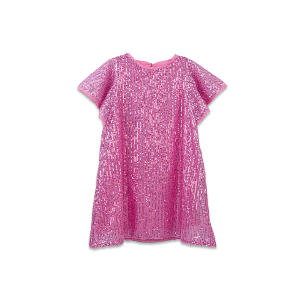 Фасон платья – трапеция с заниженной проймой рукава. При этом рукава платья короткие, скроены на манер крыльев бабочки, а горловина и срезы рукавов оформлены косой бейкой из основной однотонной розовой ткани. Низ платья обработан круглым швом. Платье представляет собой два слоя: нижний хлопчатобумажный чехол и верхний слой из сетчатого полиэстера, украшенного вертикальными полосками из круглых пайеток, которые пришиты машинным швом.