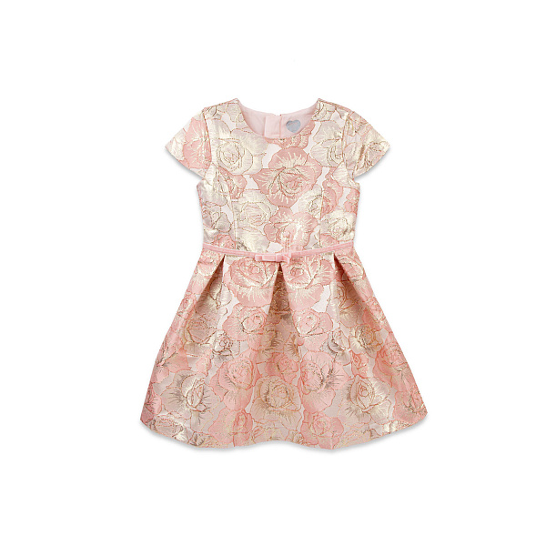 Нарядное детское платье изготовлено из синтетической фактурной ткани с имитацией набивной тафты. Платье выполнено в розовых и пудровых цветах, которые добавят легкость и изящность в образ маленькой принцессы. Крупный цветочный узор на ткани платья подчеркивается блестящей золотой нитью.