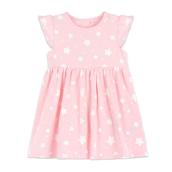 Платье сшито из натуральной ткани со 100% содержанием хлопка. Цвет изделия – розовый с декоративным принтом из маленьких белых звездочек и точек. Эта модель хороша в качестве праздничного наряда, в ней можно ходить и на представления в детский театр или на утренник в детском саду.