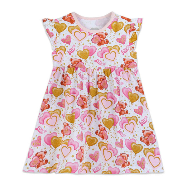 Легкое платье с коротким рукавом полностью соответствует потребностям маленькой девочки. Модель с завышенной линией талии не сковывает движения, выглядит стильно и привлекательно. Украшением служат волнистые крылышки, подчеркивающие нежный образ юной модницы. Кнопки на плече не создают сложностей в процессе переодевания. Для оформления выбраны актуальные цвета и изображения медвежат в окружении воздушных шаров.