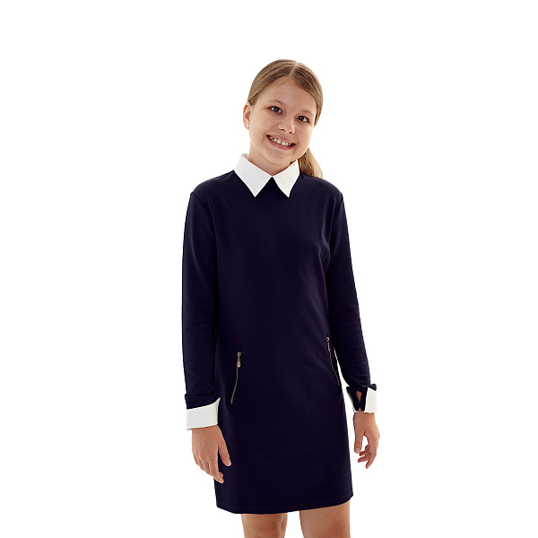 Классический воротник гармонирует с общим дизайном, добавляя изящества. С задней стороны платье застегивается на молнию, его несложно самостоятельно переодеть после школы или для уроков физкультуры. Такое школьное платье поможет создать деловой и аккуратный образ для учебного заведения.