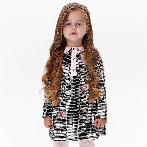 Эластан в составе ткани позволяет платью хорошо тянуться, не сковывая движений ребенка. Классический принт «гусиная лапка» в черно-белых тонах дополнен розовыми элементами — воротником и вышивками в виде бабочек. Пуговицы на передней части платья придают ему аккуратный и нарядный вид.