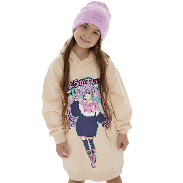 Оригинальное платье с длинным рукавом выполнено в виде удлиненной толстовки. Оно особенно понравится девочкам, предпочитающим спортивный стиль. У изделья сзади пришит объемный капюшон. Его можно надеть при сильном ветре или внезапном дожде. Кофта выполнена из плотной ткани оранжевого оттенка. Спереди на ней напечатан рисунок с персонажем из японских мультфильмов. На рукавах и подоле пришиты широкие резинки, помогающие защитить ребенка от сквозняков.