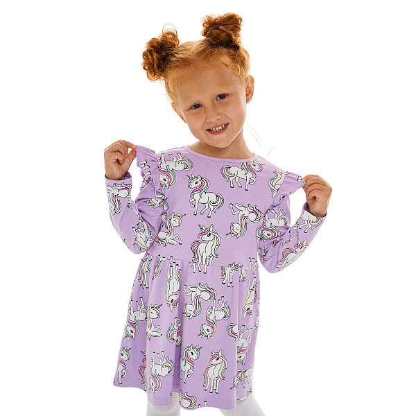 Платье выполнено в сиреневом цвете и декорировано мелкими принтами с изображениями белых единорогов. Изделие имеет круглый вырез горловины, длинные рукава и украшенные оборками плечи. На ее задней стороне имеется застежка с пуговицей, которая облегчает процесс надевания. Юбка прямая в складку, а линия талии подчеркнута резинкой.
