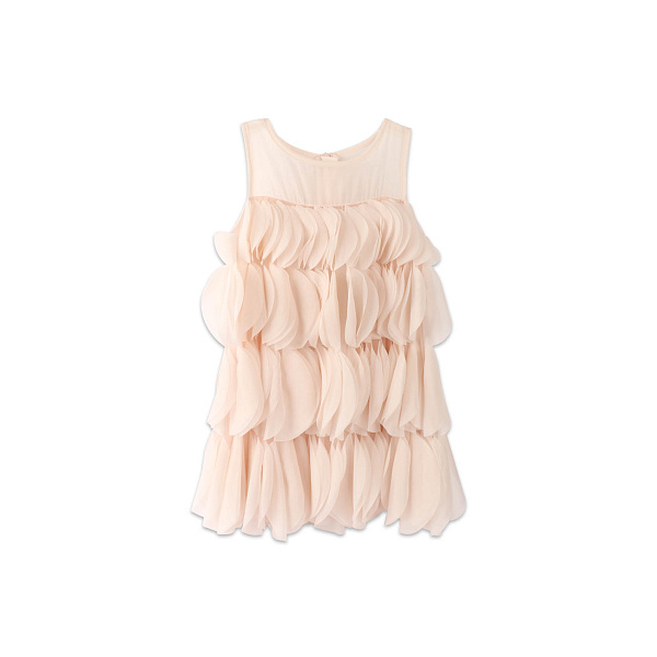 Изделие декорировано оборками. Они каскадами спускаются от уровня груди вниз. Горловина и пройма оторочены окантовкой в цвет платью. Благодаря такой конструкции и лаконичному цветовому решению ребенок не почувствует себя в вещи зажато и сможет свободно двигаться.
