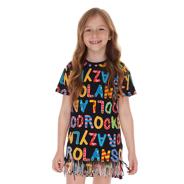 Яркие разноцветные буквы создают веселое настроение и привлекают внимание, делая каждый день маленькой модницы особенным. Низ оформлен бахромой, придающей образу непринужденность и легкость. Этот элемент добавляет оригинальности и делает платье более интересным. Комбинируется с разной обувью и аксессуарами, позволяя создать множество уникальных образов.