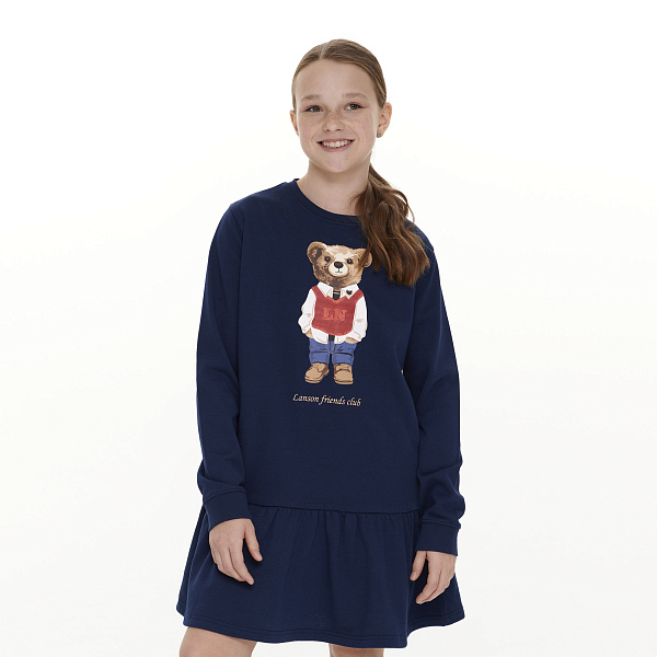 Платье для девочек с длинным рукавом выполнено в темно-синем цвете. На передней части платья изображен милый медвежонок, создающий игривое и дружелюбное впечатление. Эта деталь делает платье привлекательным для маленьких модниц, добавляя к образу элемент радости и веселья.