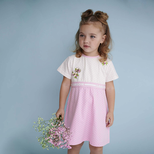 Дизайн платья отличается двумя контрастными зонами: верхняя часть выполнена в светлых тонах с нежным цветочным узором, а нижняя часть — в мягком розовом цвете. Это создает эффект женственности и свежести. Декоративная текстильная вставка с фирменной надписью «LANSON» добавляет модный акцент на талии.