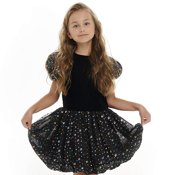 Нарядное платье черного цвета с мерцающим блеском в рукавах и юбке создает загадочный и волшебный образ. В этой модели простой черный лиф с круглым воротом эффектно сочетается с расшитыми пайетками, воздушными рукавами в форме воланов и объемной юбкой. С ней можно создать множество оригинальных образов, включая карнавальные на Новый год. Платье подойдет для утренника, похода в гости или для любого праздничного выхода.