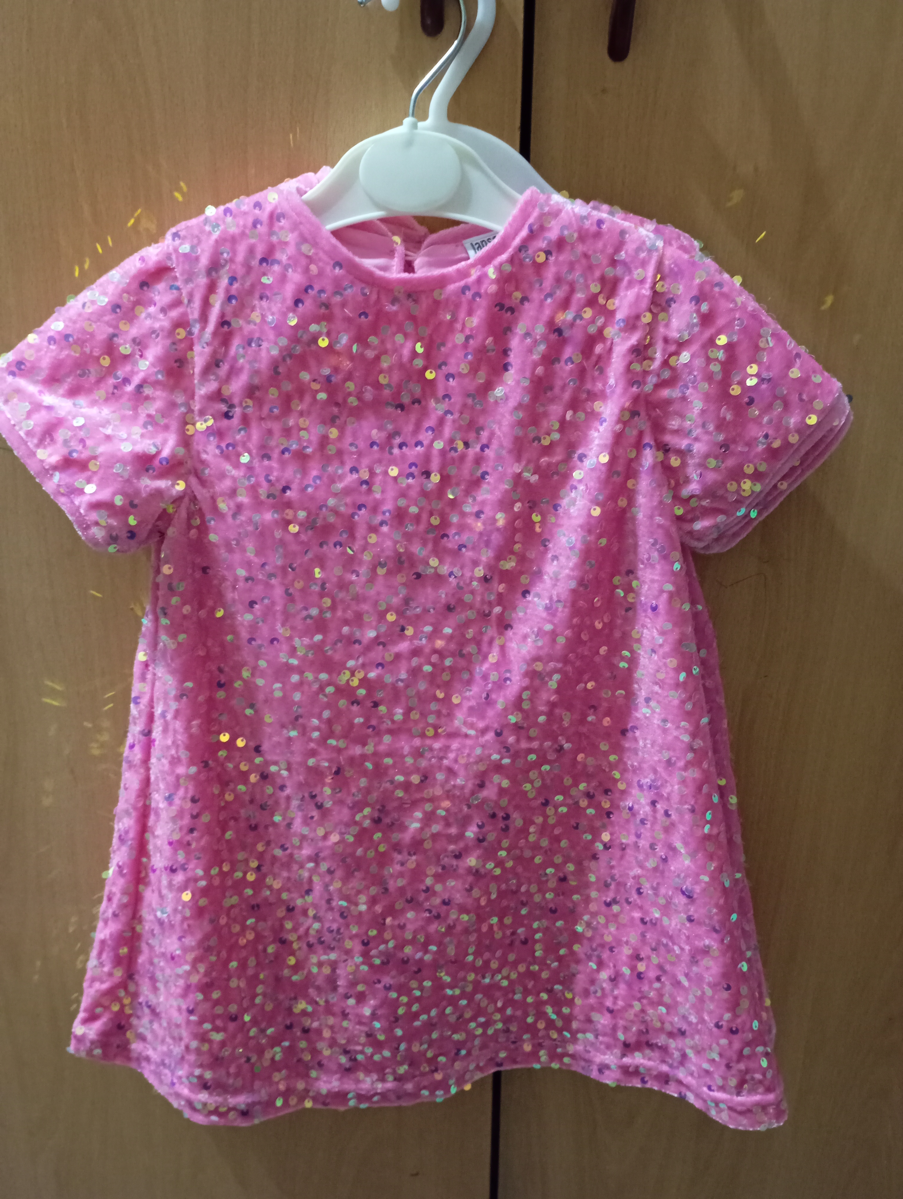 Нарядное розовое платье превратит любой день в праздник. Его бархатистая ткань украшена россыпью сияющих пайеток, которые привлекают взгляд и создают атмосферу сказки. Элегантный черный бант на булавке добавляет образу утонченность. Его можно легко отстегнуть, чтобы сменить настроение.