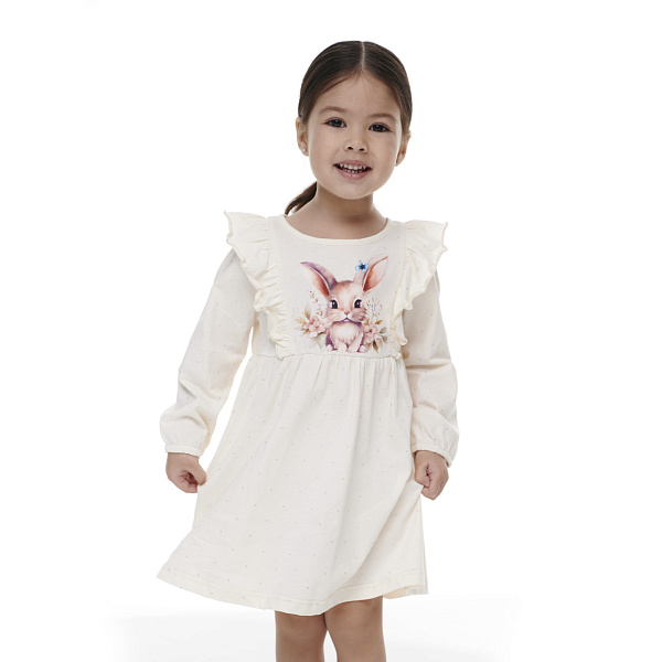 Платье с длинными рукавами для девочек выполнено в нежном молочном оттенке, создающем атмосферу легкости и воздушности. Дизайн дополнен очаровательным рисунком с зайчиком и цветочным орнаментом, придающим изделию уникальность и игривость.