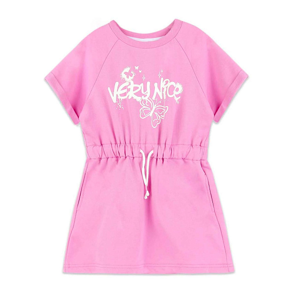 Платье выполнено в розовом цвете, на груди имеется изображение бабочки и белый текстовой принт. Платье может быть использовано в качестве повседневной или прогулочной одежды.