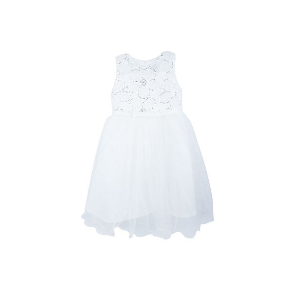 Легкое белое нарядное платье для девочек. Модель без рукавов, с пышной юбкой и расшитым серебристыми пайетками лифом. Декоративный орнамент выполнен в виде больших цветов. На талии пришит широкий атласный пояс, который завязывается на спине в виде банта. Застегивается наряд с помощью скрытой молнии.