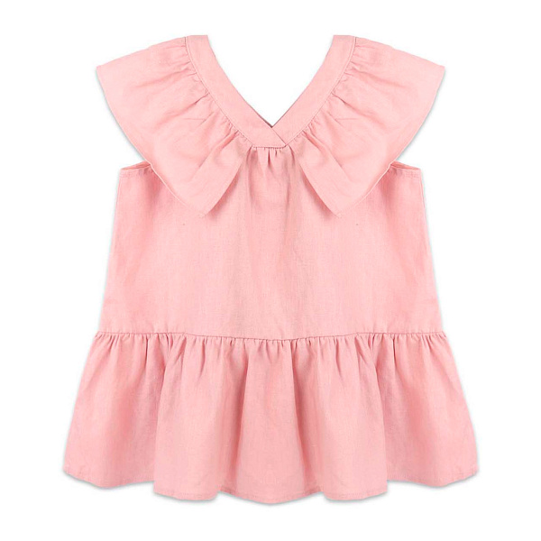 Платье имеет свободный силуэт, укороченную юбку с расширением. В изделии отсутствуют рукава, а на плечах оно удерживается широкими диагональными лямками. Платье выполнено в однотонном розовом цвете без принта и декора.