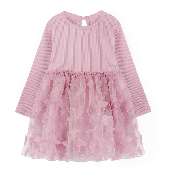 Нарядное платье с длинным рукавом, выполненное в нежно-розовом оттенке, представляет собой идеальный выбор для особенных моментов. Верх платья изготовлен из мягкого трикотажа, содержащего 95% хлопка и 5% эластана, что обеспечивает комфорт и свободу движений. Юбка выполнена из полиэстера и украшена декоративными элементами в форме бабочек, добавляющими платью легкость и игривость.