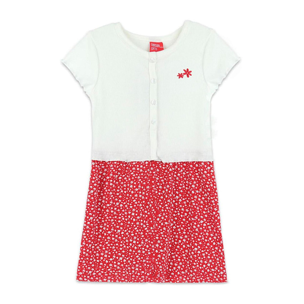 Оригинальное платье с коротким рукавом внесет приятное разнообразие в гардероб юной модницы. Модель сформирована из двух частей, отличающихся фактурой полотна и цветом. Визуально изделие напоминает стильный костюм. Оно удачно сидит на фигуре любого типа, не ограничивает движения ребенка. Украшением служат миниатюрные пуговицы и вышитые на груди цветочки.