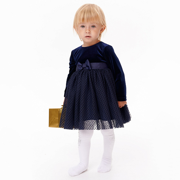 Темно-синий цвет делает платье элегантным и праздничным. На талии располагается атласный пояс с бантом, который добавляет изысканности. Длинные рукава делают платье подходящим для прохладной погоды. Удобная застежка на спине, что облегчает процесс одевания.