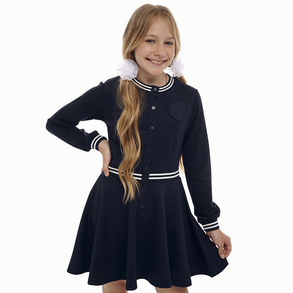 Это платье совмещает в гармоничный тандем строгие требования к школьной одежды со стремлением девочки выглядеть модно и красиво. Оно отличается оригинальным дизайнерским решением. У платья длинные рукава с манжетами, овальный вырез горловины, а также застежка на планке с пуговицами-кнопками. Юбка имеет расклешенный пошив со складками. Линия талии подчеркнута двумя белыми полосами, такими же полосками отведены манжеты рукавов и воротник. На груди имеется декоративный элемент в виде эмблемы. Цвет платья - темно-синий.